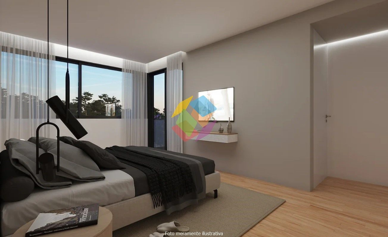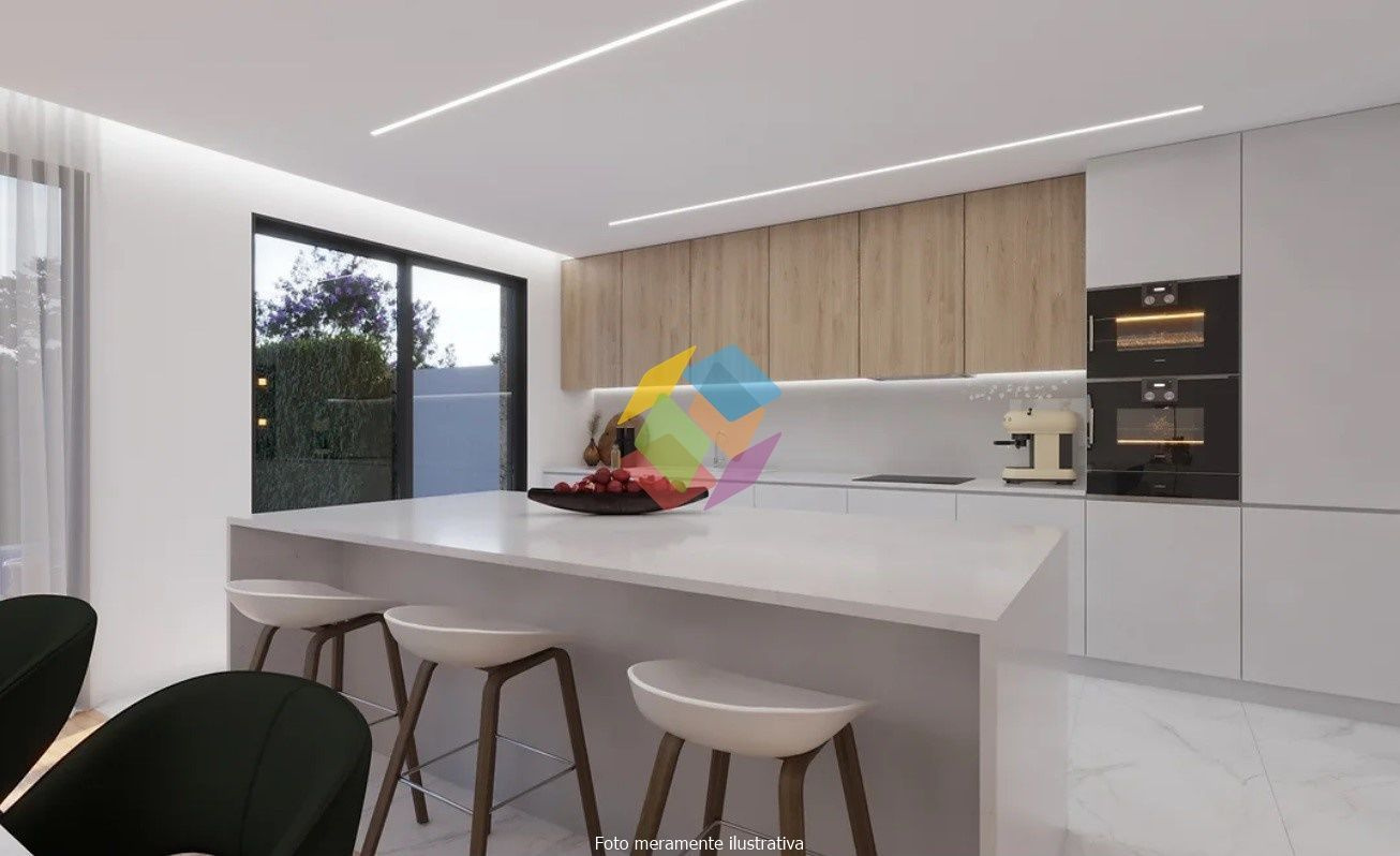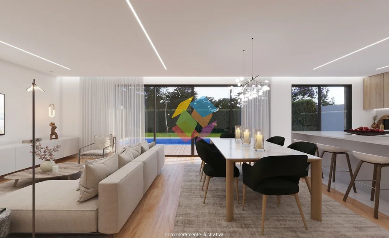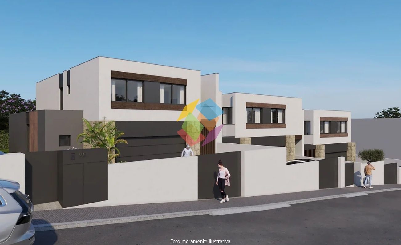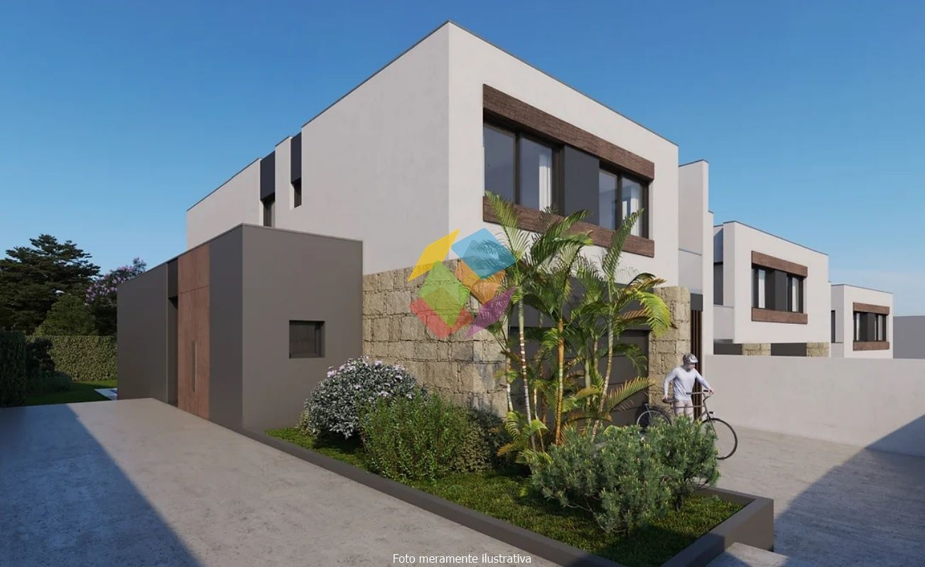 Moradia de Arquitectura Moderna Geminada (Nova) T3 - Escapães, Stª. Maria da Feira, localizada em zona habitacional calma e com bons acessos rodoviários...O Imóvel é composto por 2 pisos (Rés-do-chão e 1º Andar):..Rés-do-chão:.- Cozinha e sala em Open space, com acesso directo ao logradouro/jardim exterior,.- Casa de banho de serviço,.- Despensa,.- Garagem fechada para 2 carros com acesso directo ao interior da habitação,.- Lavandaria e zona técnica (equipamentos),..1º Andar:.- 3 suítes com closet e casa de banho completo, duas delas com varanda,..Características / Equipamentos.- Caixilharia com rotura térmica, marca Navarra,.- Estores térmicos em lâmina de alumínio 45,.- Aquecimento equipado com aparelhos de Ar condicionado Marca \"Mitsubishi\",.- Aspiração central,.- Vídeo porteiro a cores da Comelit,.- Carpintaria em madeira lacado mate,.- Pavimento em madeira de Riga,.- Pavimento em cerâmica de 1º qualidade na cozinha, sanitários, lavandaria, arrumos e garagem,.- Louças sanitárias suspensas,.- Caixilharia de ruptura térmica com vidro duplo térmico,.- Estores eléctricos, térmicos em lâmina de alumínio 45,.- Kit forçado 2 painéis solares para aquecimento de águas sanitárias acumulador de 300L,.- Kit produção de energia 6 painéis com potência de 2760W,.- Revestimento exterior a capoto,.- Tomada de carregamento para carro eléctrico,.- Sistema de alarme completo,.- Sistema de Videovigilância, pré-instalação..- Portões automáticos,.- Sistema de rega, pré-instalação,..Moradia de Arquitectura Moderna, onde se destaca a excelente exposição solar, luminosidade interior, excelentes áreas, acabamentos e materiais de qualidade superior e sua localização entre S. J. da Madeira e Stª. Maria da Feira...Na zona exterior das traseiras do imóvel, existe uma zona de jardim, a qual e dadas as dimensões permite a construção de uma piscina...Caso pretenda incluir a piscina, o valor não está incluído no preço final do imóvel...O que espera para ver este SONHO, ligue já e saiba mais!..AMI 10354