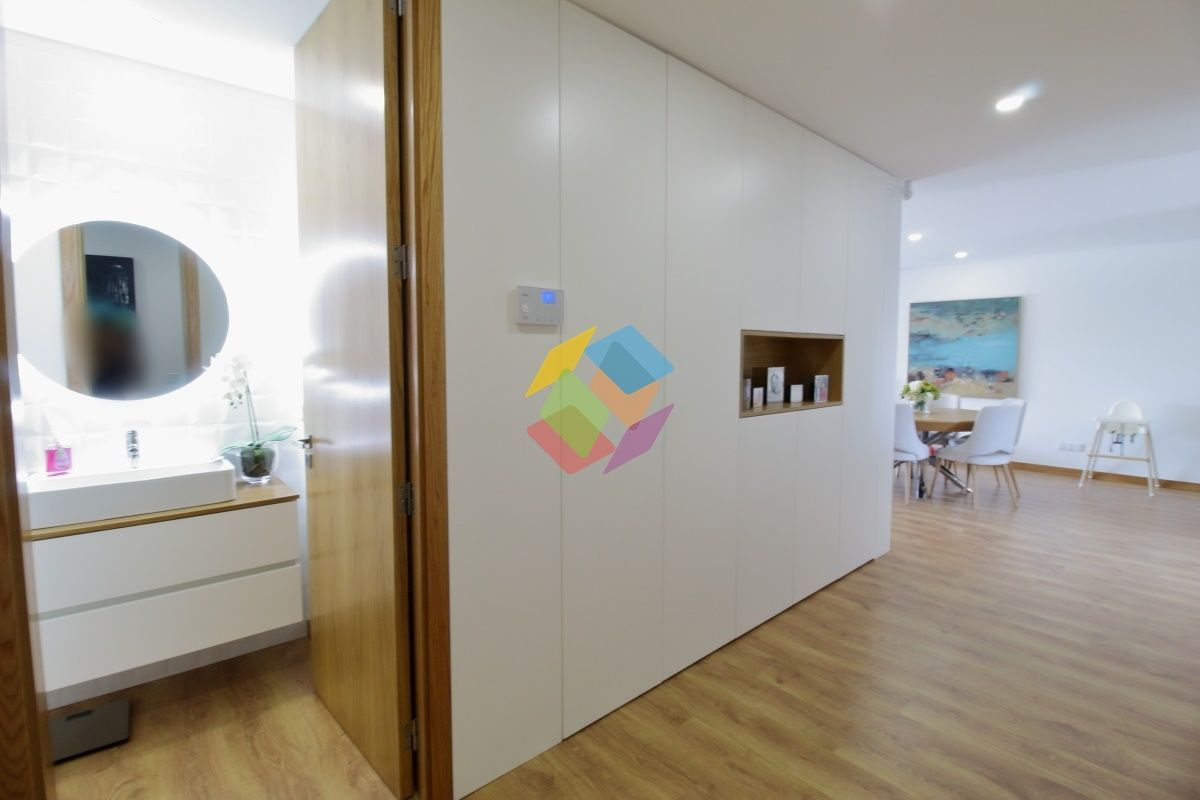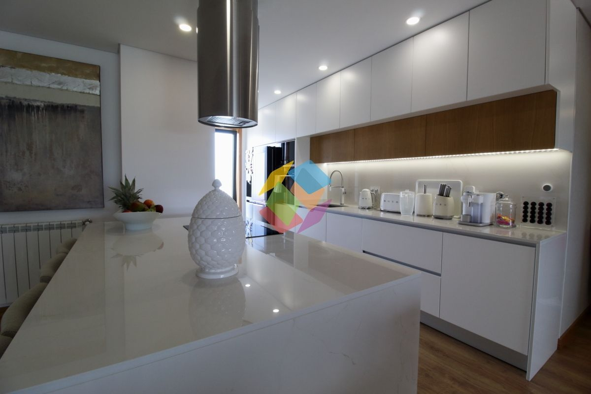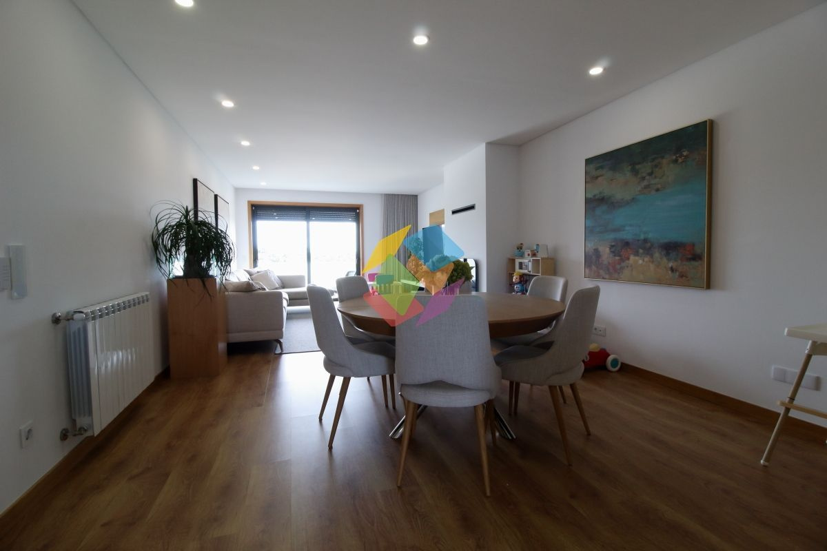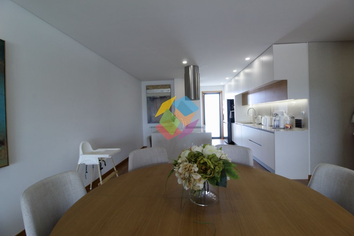 Apartamento T3 como Novo em Santa Maria da Feira todo mobilado...Imóvel com excelentes áreas, com varanda nas duas frentes, no último andar..Todas as divisões dispõe de luz direta à exceção da casa de banho de serviço e da casa de banho de apoio aos quartos...Garagem para duas viaturas com portão automático e sistema de vigilância...Edifício com elevador...Este apartamento está equipado com:.Sistema de Vigilância.Aquecimento Central.Recuperador a Pellets .Domótica via Wi-fi.Estores Térmicos e Elétricos e Cortinados Elétricos.Porta de entrada Blindada.Cozinha com ilha e tampo com pedra DEKTON, exaustor central, frigorífico estilo americano, forno, placa e micro-ondas marca TEKA, torneiras e equipamentos da SMEG.Carpintaria Tipo Faia ou Carvalho com portas interiores do chão até ao teto..Roupeiros Embutidos.Sanitários Suspensos.Tetos Falsos Com Luz Led.Painel Solar com depósito 300 Litros e esquentador de água .Tintas interiores brancos de primeira qualidade .Sistema elétrico certificado .Gás Canalizado.Esquentador Inteligente ...Marque já a sua visita...AMI 10354