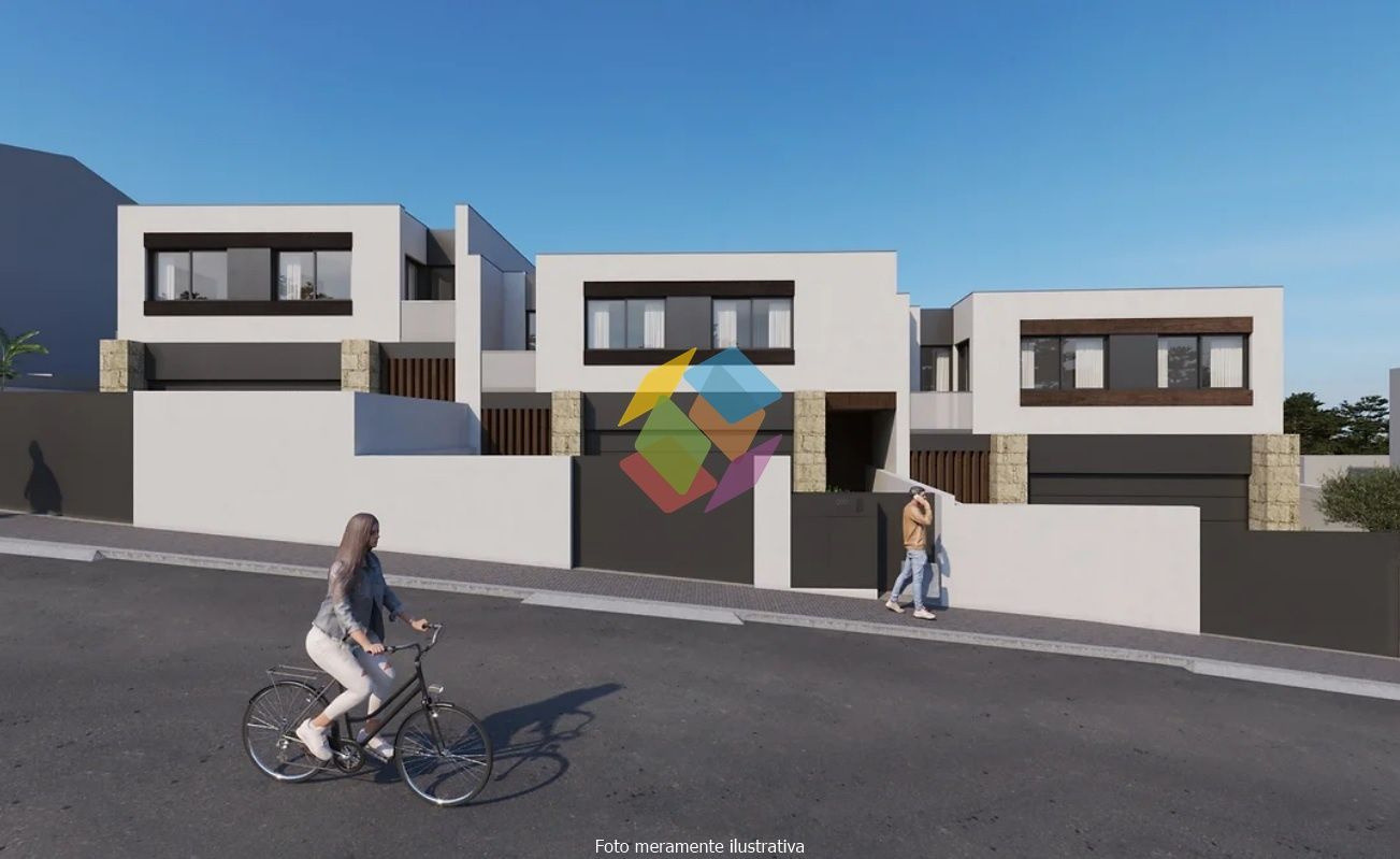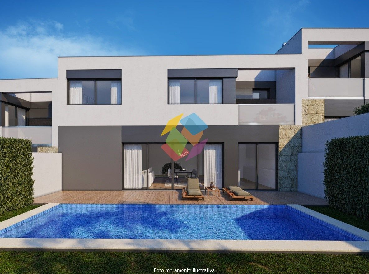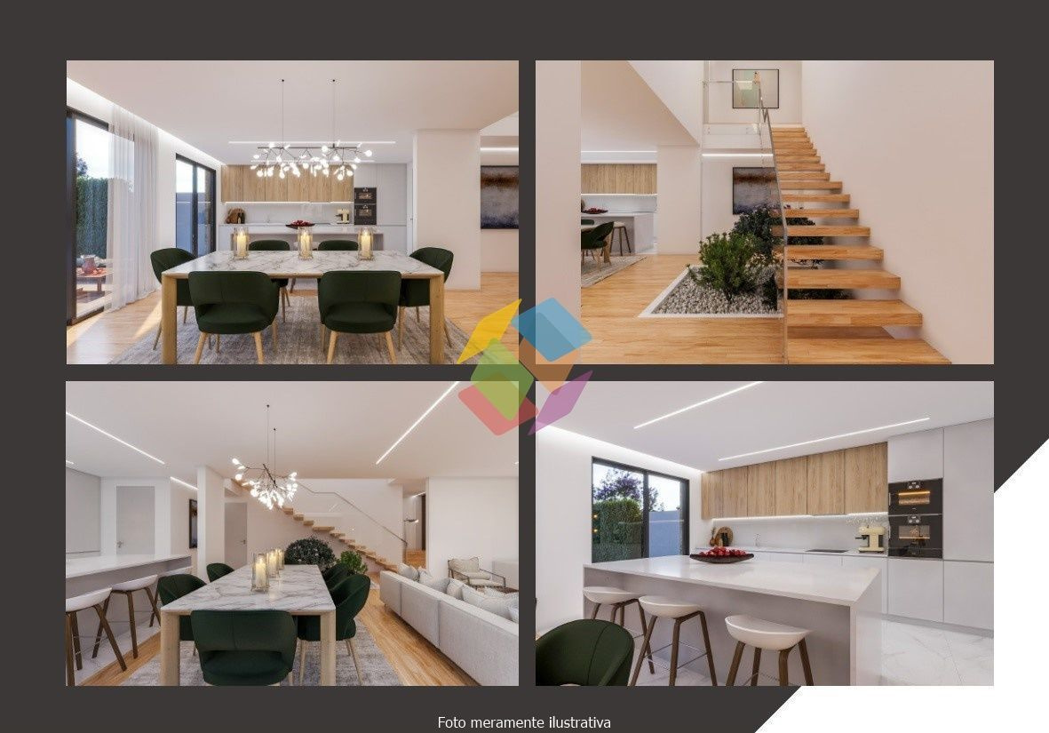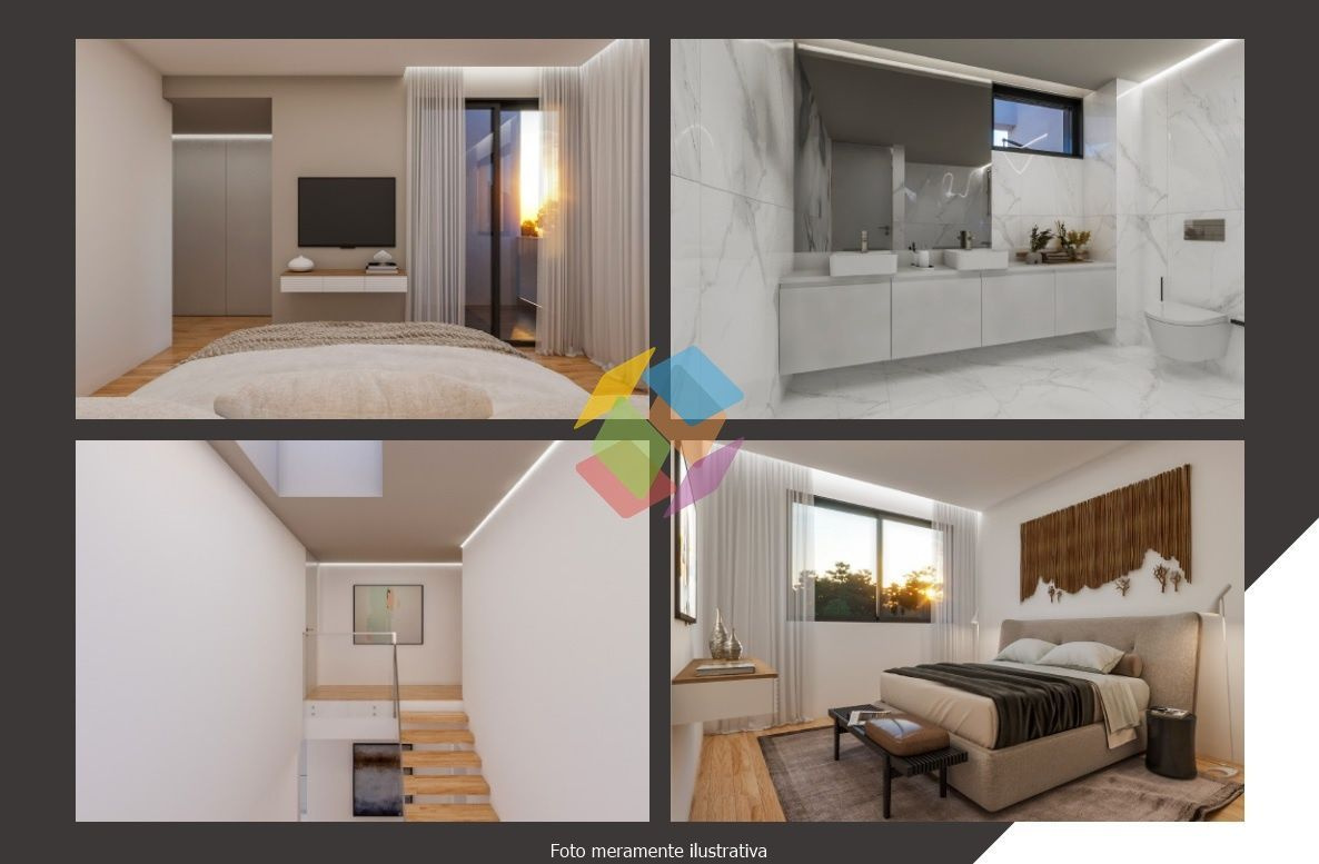 Moradia de Arquitectura Moderna em Banda (Nova) T4 - Escapães, Stª. Maria da Feira, localizada em zona habitacional calma e com bons acessos rodoviários...O Imóvel é composto por 2 pisos (Rés-do-chão e 1º Andar):..Rés-do-chão:.- Cozinha e sala em Open space, com acesso directo ao logradouro/jardim exterior,.- Casa de banho de serviço,.- Despensa,.- Garagem fechada para 2 carros com acesso directo ao interior da habitação,.- Lavandaria e zona técnica (equipamentos),..1º Andar:.- 2 suítes com closet e casa de banho completo, um deles com varanda,.- 2 quartos com roupeiros embutidos, um deles com varanda,.- Casa de banho de apoio aos outros quartos...Características / Equipamentos.- Caixilharia com rotura térmica, marca Navarra,.- Estores térmicos em lâmina de alumínio 45,.- Aquecimento equipado com aparelhos de Ar condicionado Marca \"Mitsubishi\",.- Aspiração central,.- Vídeo porteiro a cores da Comelit,.- Carpintaria em madeira lacado mate,.- Pavimento em madeira de Riga,.- Pavimento em cerâmica de 1º qualidade na cozinha, sanitários, lavandaria, arrumos e garagem,.- Louças sanitárias suspensas,.- Caixilharia de ruptura térmica com vidro duplo térmico,.- Estores eléctricos, térmicos em lâmina de alumínio 45,.- Kit forçado 2 painéis solares para aquecimento de águas sanitárias acumulador de 300L,.- Kit produção de energia 6 painéis com potência de 2760W,.- Revestimento exterior a capoto,.- Tomada de carregamento para carro eléctrico,.- Sistema de alarme completo,.- Sistema de Videovigilância, pré-instalação..- Portões automáticos,.- Sistema de rega, pré-instalação,..Moradia de Arquitectura Moderna, onde se destaca a excelente exposição solar, luminosidade interior, excelentes áreas, acabamentos e materiais de qualidade superior e sua localização entre S. J. da Madeira e Stª. Maria da Feira...Na zona exterior das traseiras do imóvel, existe uma zona de jardim, a qual e dadas as dimensões permite a construção de uma piscina...Caso pretenda incluir a piscina, o valor não está incluído no preço final do imóvel...O que espera para ver este SONHO, ligue já e saiba mais!..AMI 10354