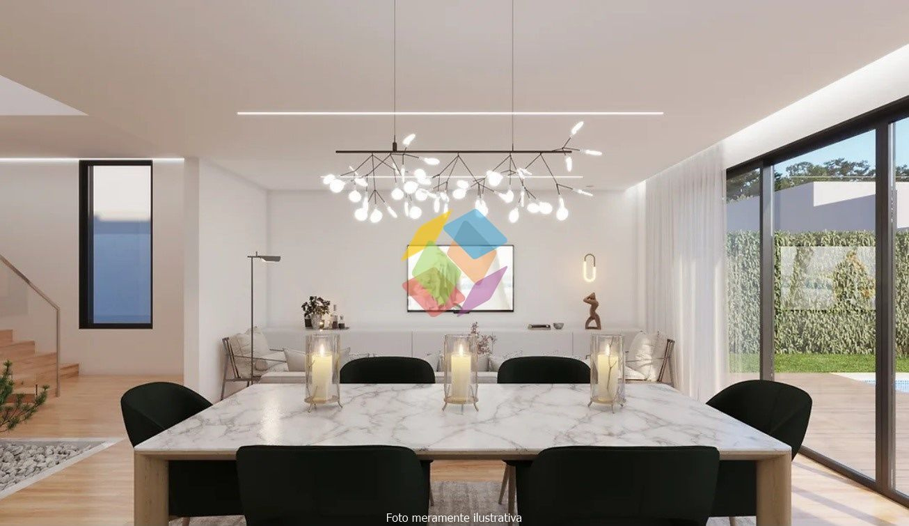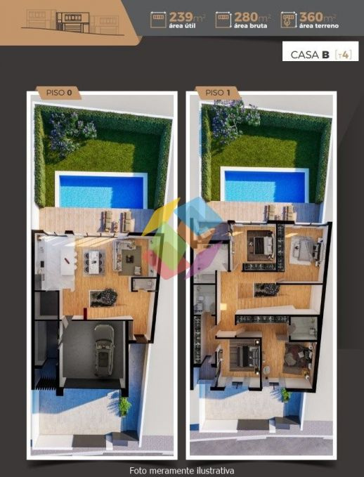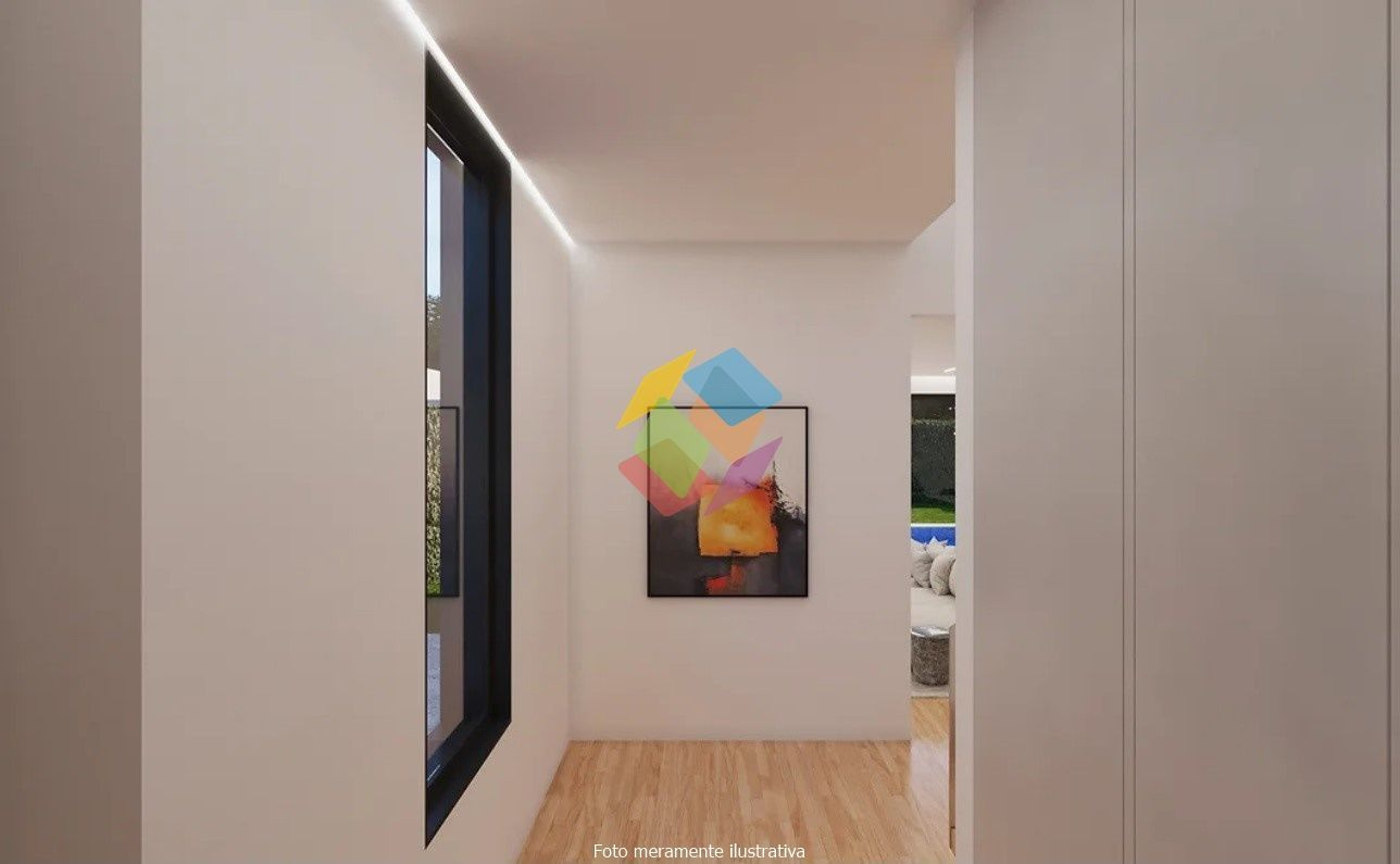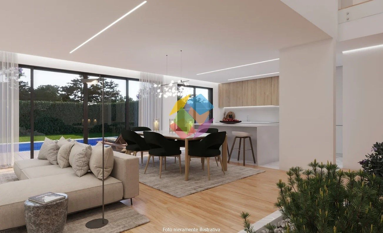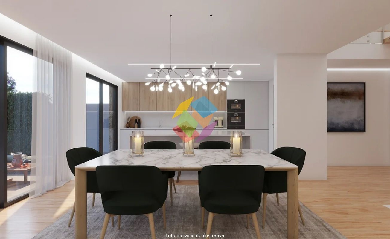 Moradia de Arquitectura Moderna em Banda (Nova) T4 - Escapães, Stª. Maria da Feira, localizada em zona habitacional calma e com bons acessos rodoviários...O Imóvel é composto por 2 pisos (Rés-do-chão e 1º Andar):..Rés-do-chão:.- Cozinha e sala em Open space, com acesso directo ao logradouro/jardim exterior,.- Casa de banho de serviço,.- Despensa,.- Garagem fechada para 2 carros com acesso directo ao interior da habitação,.- Lavandaria e zona técnica (equipamentos),..1º Andar:.- 2 suítes com closet e casa de banho completo, um deles com varanda,.- 2 quartos com roupeiros embutidos, um deles com varanda,.- Casa de banho de apoio aos outros quartos...Características / Equipamentos.- Caixilharia com rotura térmica, marca Navarra,.- Estores térmicos em lâmina de alumínio 45,.- Aquecimento equipado com aparelhos de Ar condicionado Marca \"Mitsubishi\",.- Aspiração central,.- Vídeo porteiro a cores da Comelit,.- Carpintaria em madeira lacado mate,.- Pavimento em madeira de Riga,.- Pavimento em cerâmica de 1º qualidade na cozinha, sanitários, lavandaria, arrumos e garagem,.- Louças sanitárias suspensas,.- Caixilharia de ruptura térmica com vidro duplo térmico,.- Estores eléctricos, térmicos em lâmina de alumínio 45,.- Kit forçado 2 painéis solares para aquecimento de águas sanitárias acumulador de 300L,.- Kit produção de energia 6 painéis com potência de 2760W,.- Revestimento exterior a capoto,.- Tomada de carregamento para carro eléctrico,.- Sistema de alarme completo,.- Sistema de Videovigilância, pré-instalação..- Portões automáticos,.- Sistema de rega, pré-instalação,..Moradia de Arquitectura Moderna, onde se destaca a excelente exposição solar, luminosidade interior, excelentes áreas, acabamentos e materiais de qualidade superior e sua localização entre S. J. da Madeira e Stª. Maria da Feira...Na zona exterior das traseiras do imóvel, existe uma zona de jardim, a qual e dadas as dimensões permite a construção de uma piscina...Caso pretenda incluir a piscina, o valor não está incluído no preço final do imóvel...O que espera para ver este SONHO, ligue já e saiba mais!..AMI 10354